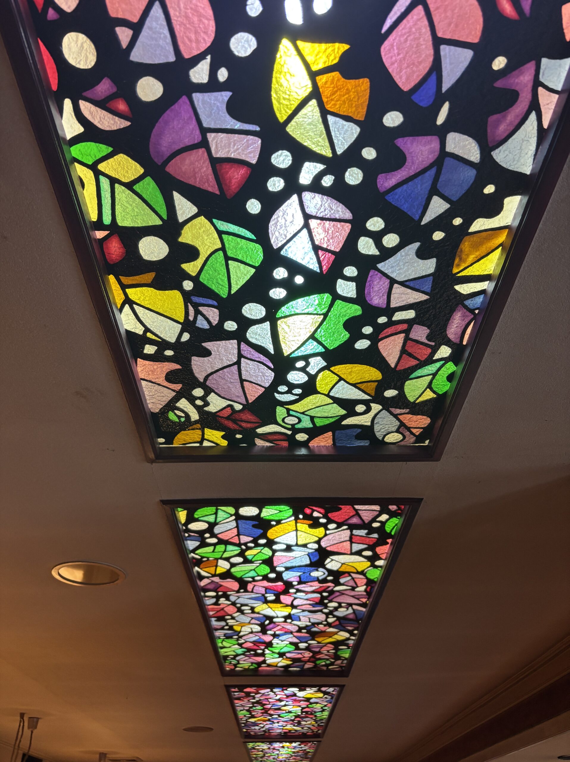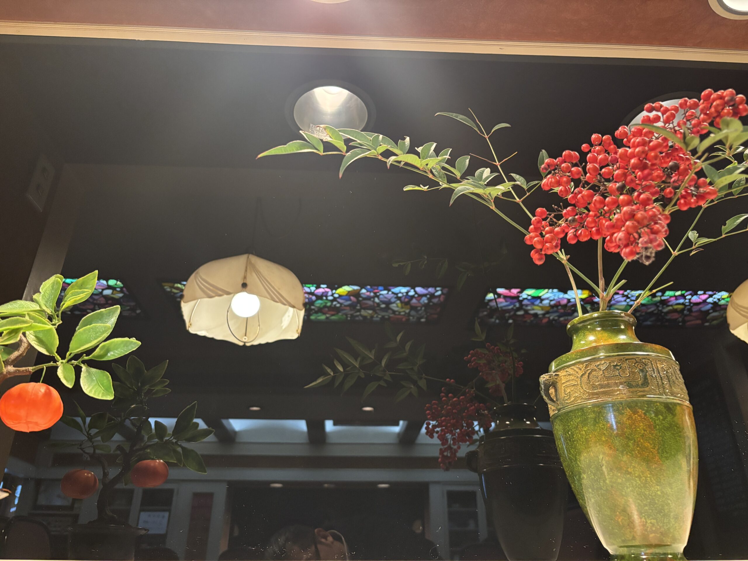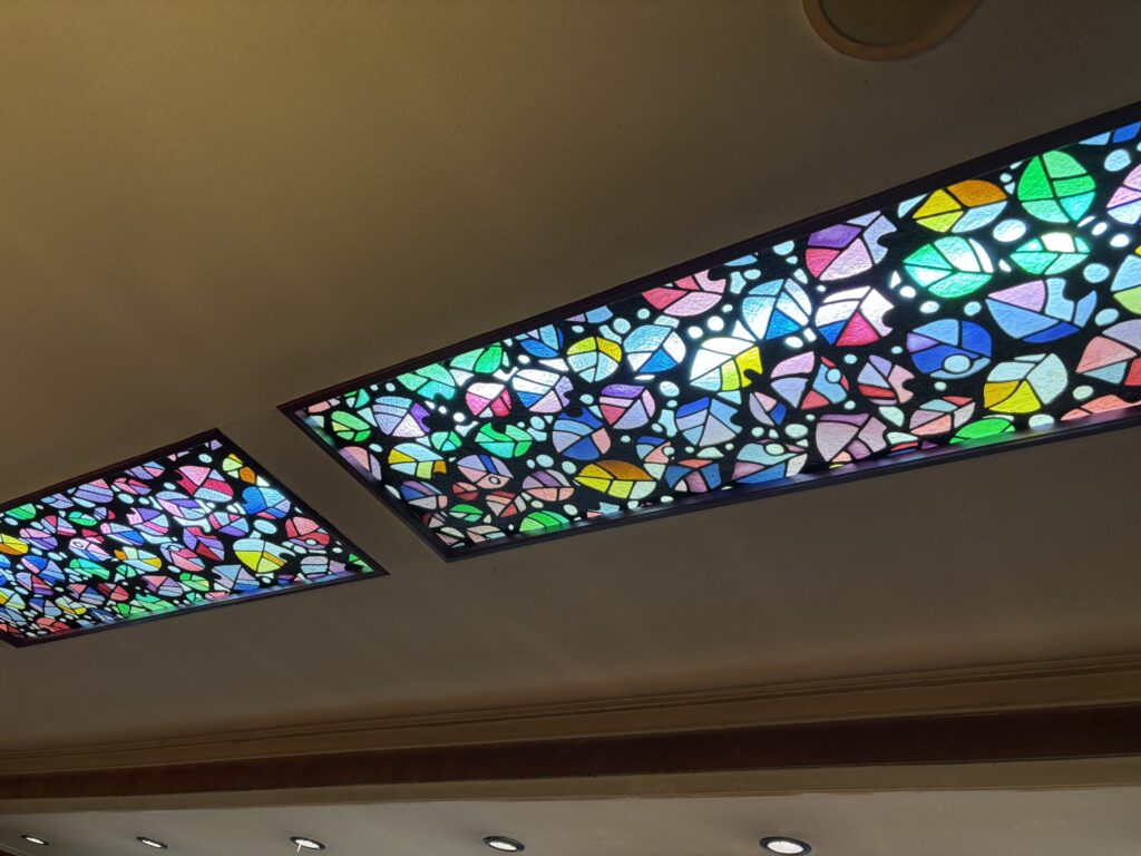 ◆ ステンドグラスが彩る癒やしの空間 昭和56年(1981年)の自社ビル移転時に設置されたステンドグラスが当店のシンボルです。天井から降り注ぐ優しい光が、木の温もりある店内を幻想的に照らします。レトロな空間で、日常を忘れる穏やかな時間をお過ごしください。