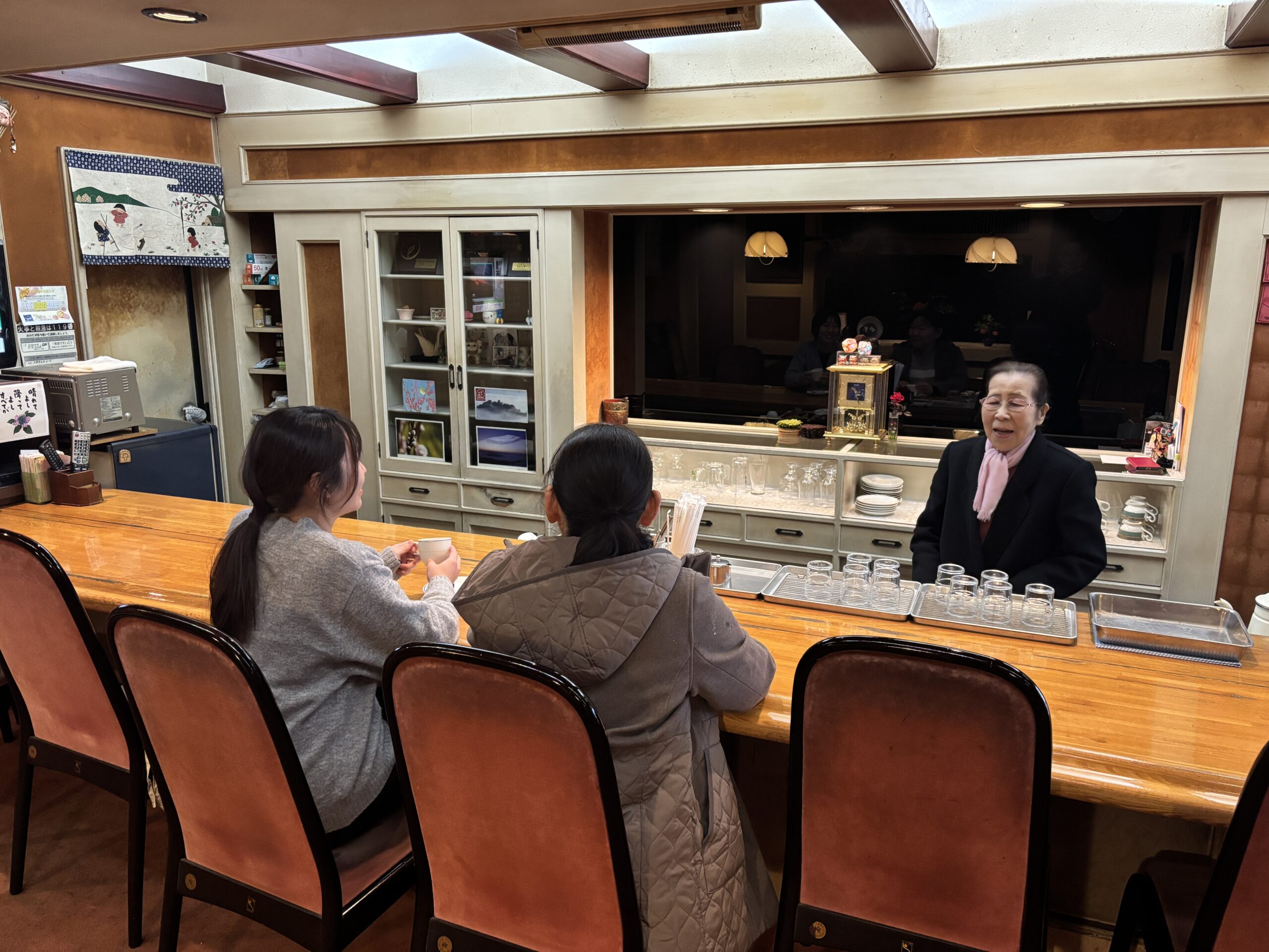 朝8:30から営業しております。大野散策の休憩や、懐かしい昭和の雰囲気を楽しみに、ぜひ「喫茶エミ」へお越しください。 「足腰が立つ限り、コーヒーを淹れ続けます」というママが、皆様のご来店を心よりお待ちしております。